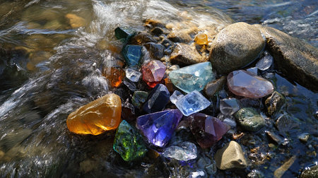 A collection of colorful gems and stones glistens in a stream, illuminated by sunlight, surrounded by smooth rocks and flowing water.