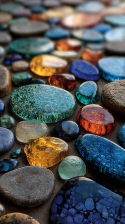 A captivating close-up of colorful pebbles and stones scattered on a sandy shore illuminated by soft sunlight, creating a serene natural ambiance.