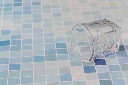 Many broken pieces of glass of various sizes and shapes lie on the ground. Oblong pieces of glass. Dangerous sharp fragments of transparent glass. Background, backdrop.