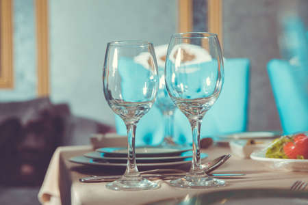 Empty glasses set in restaurant. Part of interior . wine glasses on the table in front of the empty wineglass.