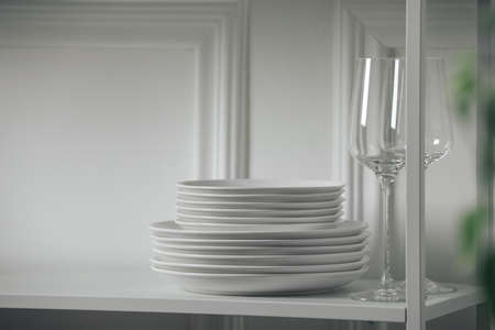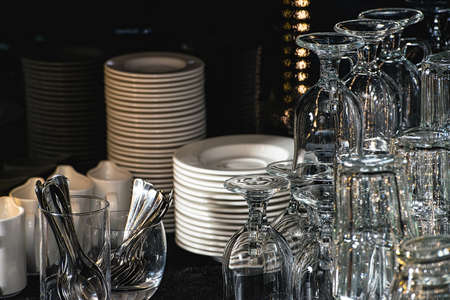 Stacked clean dishes and glasses on table indoors
