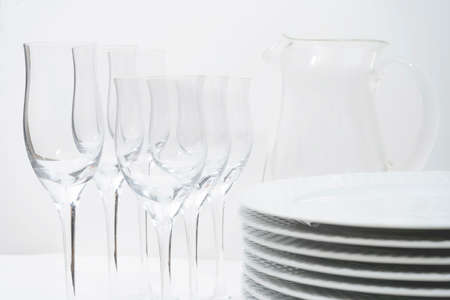 Set of stacked plates, crystal stemware and a glass jug on a white table.