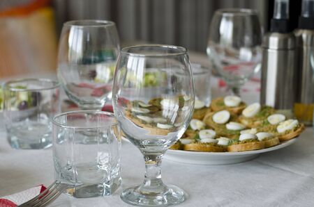 Catering service. Table setting, glass goblets, cutlery