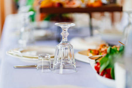 Empty glasses for wine and champagne in a row at the banquet table
