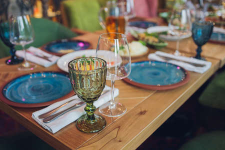 Luxury table settings for fine dining with and glassware, beautiful blurred background. For events, weddings. WEDDINGS, Wedding detals and planing.
