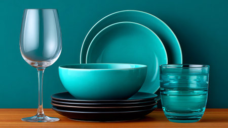 A set of dishes and kitchen utensils on a colored background.