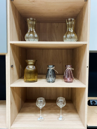 A beautifully crafted wooden shelf proudly showcasing a stunning variety of exquisite vases and elegant wine glasses, making it a striking and eyecatching addition to any room in your lovely home