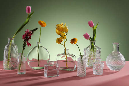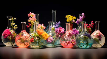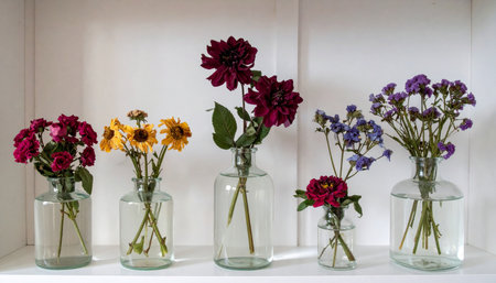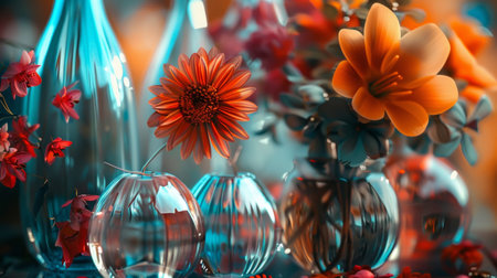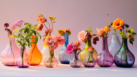 Colorful flowers arranged in various glass vases. The vibrant and artistic setup highlights themes of beauty and floral decoration.