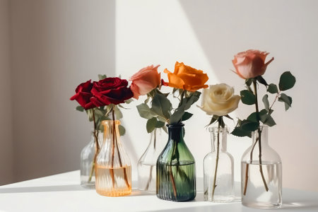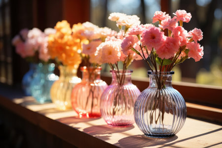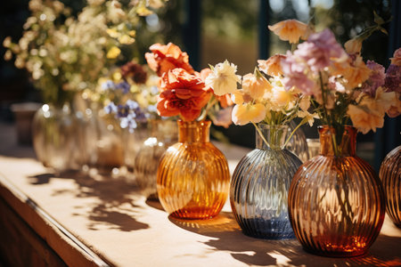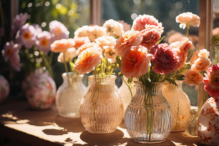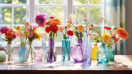 Vibrant flower arrangements in glass bottles on wooden table in sunlit room. That the image is generated using AI.