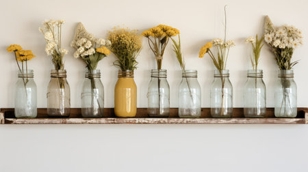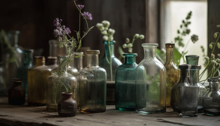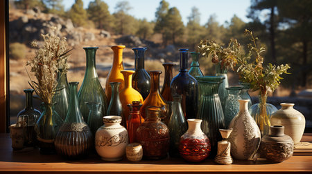 Rustic vase collection showcases alchemy of herbal medicine and nature generated by artificial intelligence