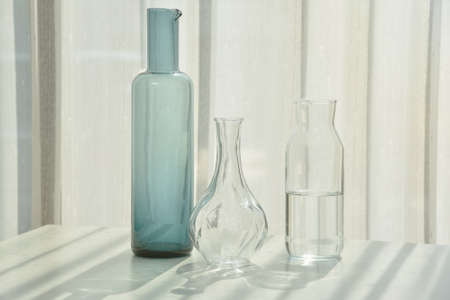 Glassware reflect sunlight shadow effect, Summer still life scene, Transparent glittering glasses of water, Warm light vibe in sunny day.