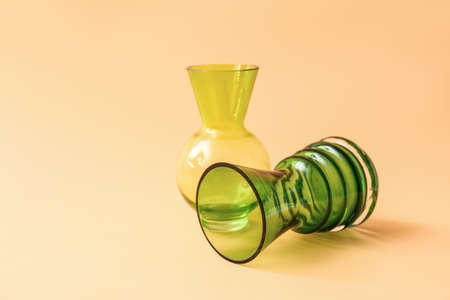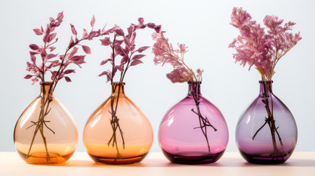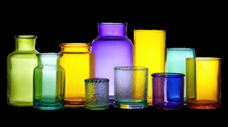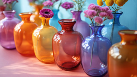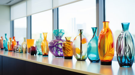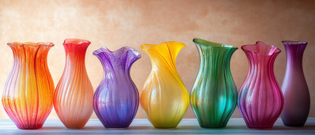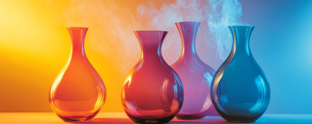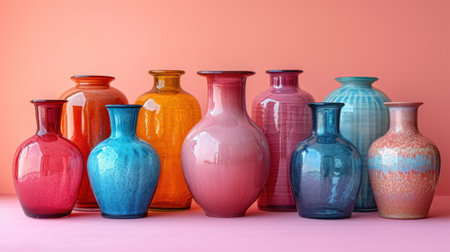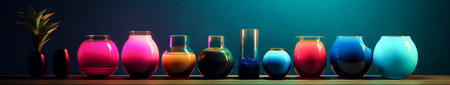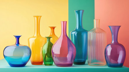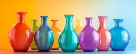 Colorful glass vases in a row against a gradient backdrop, modern art concept