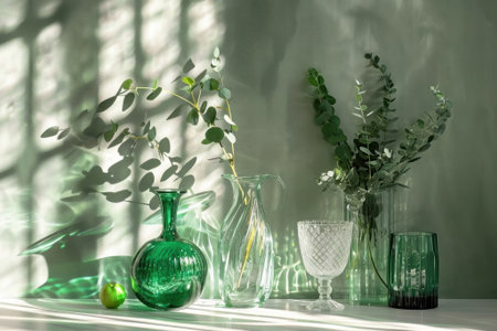 An artful composition of elegant green glassware and leafy stems, with playful light and shadows creating a serene ambiance. Perfect for adding a touch of nature beauty to your surroundings. AI generated