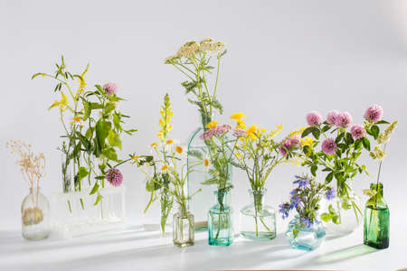 Wild field herbs in bottles of different shapes on a white-gray background as a decoration. Card