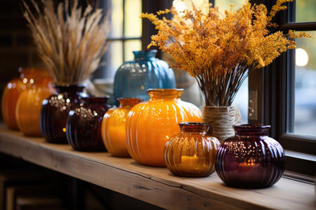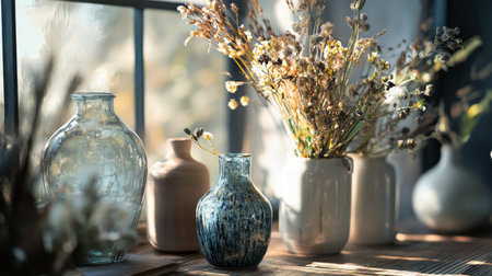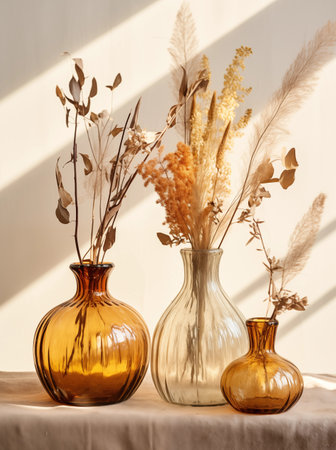 A collection of amber glass vases filled with dried flowers, illuminated by warm sunlight, creating an elegant and natural decorative display.