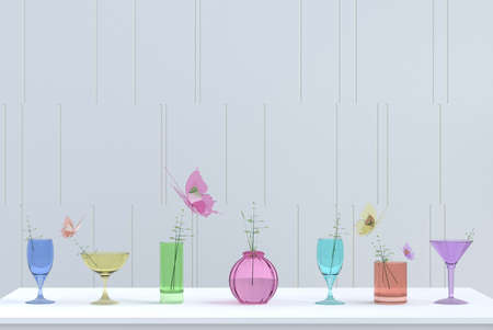 Colorful glass background on Christmas and New Year party day. Room decor with branch flower,colorful glass of water,butterfly,pink,blue,green,yellow,purple,orange on white table &white wall.3d render