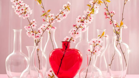 A red heart vase surrounded by clear glass vases filled with beautiful cherry blossoms