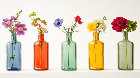 A vibrant row of six bottles, each paired with a different colored flower, highlighting variety and beauty in this arrangement.