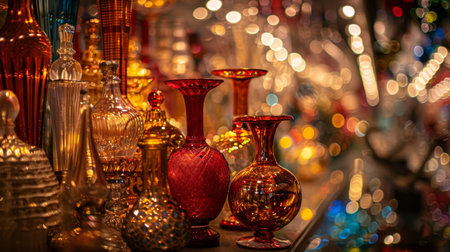 A collection of colorful glass vases beautifully displayed with vibrant bokeh lights in the background.