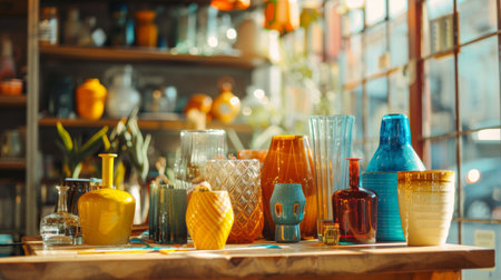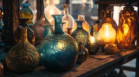 A collection of vintage-style glass vases in various colors and shapes illuminated by warm, ambient lighting, creating an artistic, cozy atmosphere.