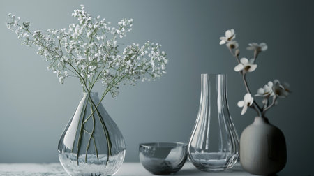 An elegant arrangement of transparent glassware and delicate blossoms, illuminated by soft, diffused light.