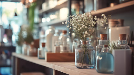 A stylish arrangement of beauty products on a wooden shelf in a bright boutique, with soft focus lighting.