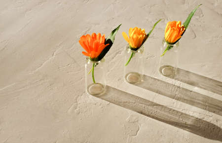 Bottles with calendula flowers for cosmetics, natural medicine, essential oils or other liquids on textured background