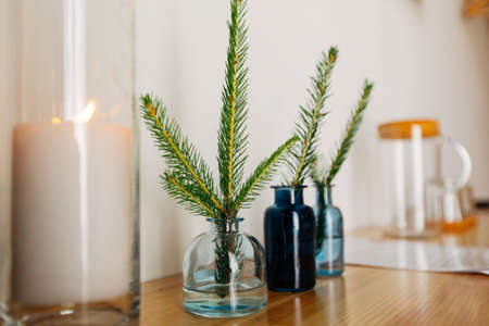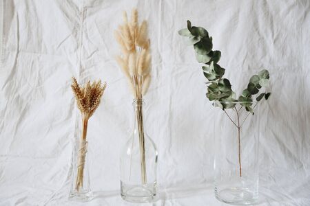 Vintage glass vases with dried grass. Trendy interior decoration. Cozy home with dried fluffy plants.
