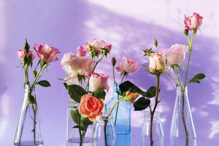 Fresh pink roses in glass transparent vases, flowers for romantic greetings, happy birthday, invitations, postcard