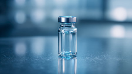 A sleek glass vial with pristine liquid rests on a mirror-like surface, embodying progress in medical science and cutting-edge laboratory advancements.