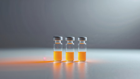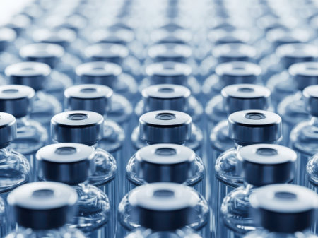 An AI-generated illustration of a neatly organized array of medical vials in amber and clear glass, all secured with grey rubber caps