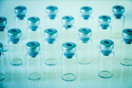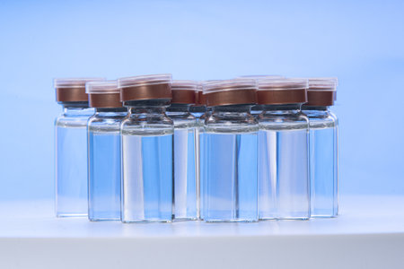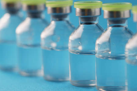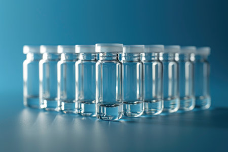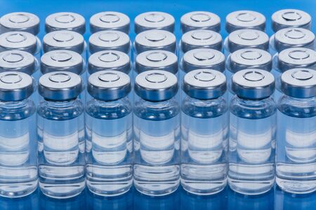 Transparent medical vials on a blue surface for healthcare, medical or scientific investigation