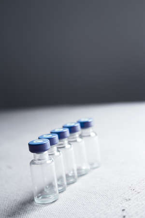 Glass vials with transparent vaccine for injection on a light gray surface. medicines and healthcare