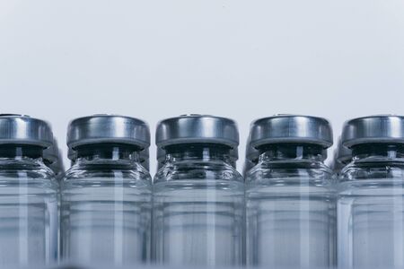 Detail of covid-19 vaccine bottles on factory conveyor during production