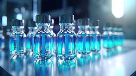 Clear glass vials lined up in a minimalistic arrangement emphasizing ecology ideas Generative AI