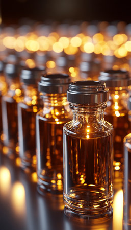Golden Hour Pharmaceuticals Vials in a Row with Warm, Glowing Light, Healthcare Background.