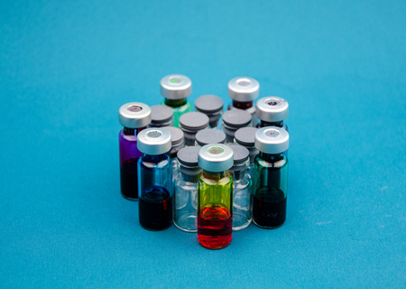 Liquid samples in lab containing medicine in glass vials and ampoules