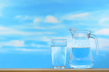 Fresh and clean drinking water being poured from jug into glass on sky background