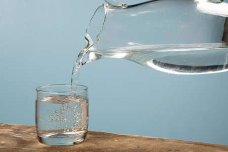 Fresh water pouring from the jug into a glass on the blue background with copy space. Drink water is important for optimal health