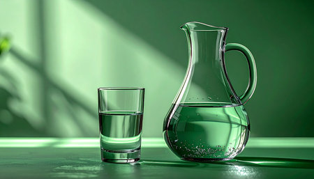 A simple glass pitcher and a waiting glass are filled with fresh, clear water. Bathed in the soft, diagonal rays of morning sunlight against a serene green backdrop, this scene evokes a sense of calm, purity, and a healthy start to the day.