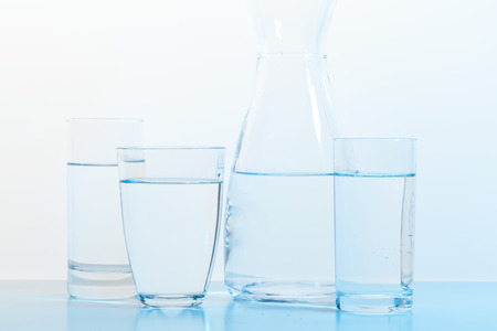 Closeup shot of jug and glass with purified water on clean white kitchen surface.