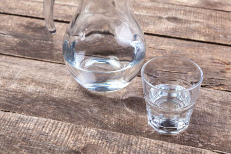 Glase vase with water on wooden background. Decorative clear glass vase and copy space. Beauty and fragility.