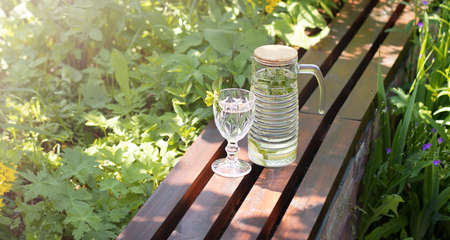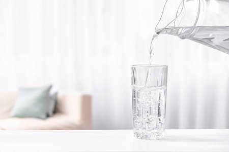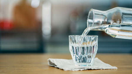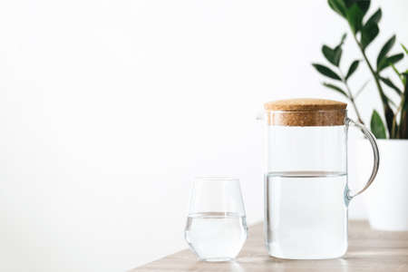 A carafe with clean drinking water stands on a light kitchen table. Benefits of drinking clean water. Drinking water shortage concept. World Water Day