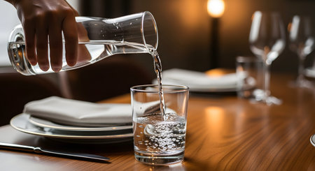 A hand pours clear water from a glass carafe into a glass on a wooden dining table. The setting is elegant with blurred wine glasses in the background, representing hydration, fine dining, and hospitality.