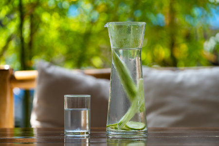 Water in glass with cucumber and lemon on wooden table in tropical cafe, Thailand, close up