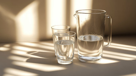 Glass jug and matching glasses filled with water, set on a light surface, capturing a simple, refreshing look with minimal shadows.