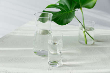 Morning glass and jar of clean water with two big green leaves on white table. Breakfast with sunlight long shadow and reflection. Concept of a healthy lifestyle