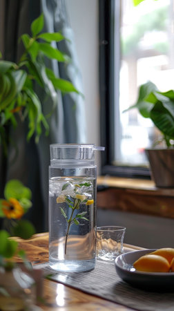 Clear Glass Pitcher Filled with Water on a Sun-Drenched Kitchen Counter with Room for Text