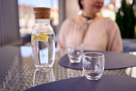 Bottles of clear water are on a tables in restourant. Healthy lifestyle concept.