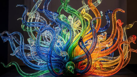 Colorful glass sculpture with intertwined tentacle-like forms in various vibrant colors.